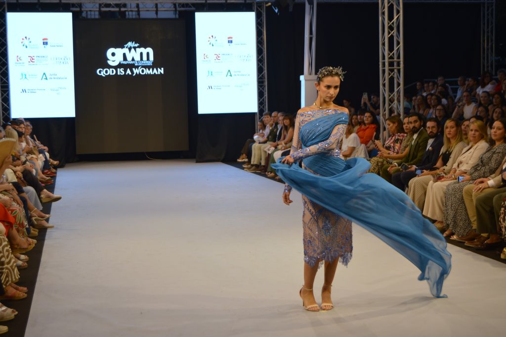 God is a woman ha sido su propuesta sobre la moqueta de la Plaza Real, resaltando en una colección de trajes de fiesta la figura femenina, su sexualidad y el empoderamiento de la mujer. Tejidos con pedrería, lentejuelas, polipiel, volúmenes exuberantes y formas infinitas “que evocan a las diferentes creaciones de Dios”.