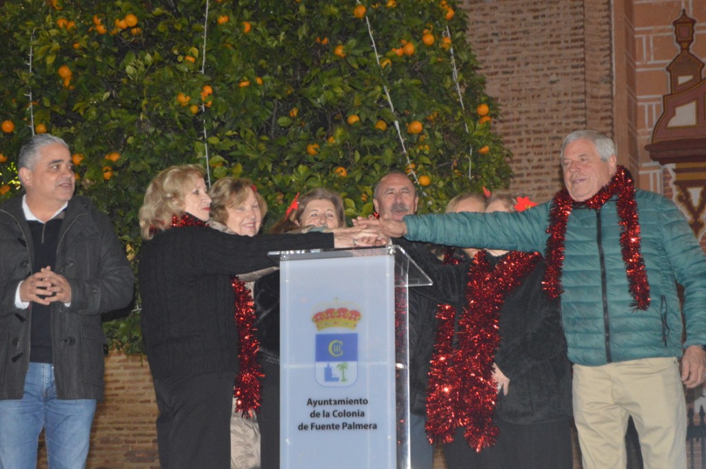 Seguidamente se realizó la cuenta atrás contando del 10 al 1 y los mayores le dieron al botón al unísono, comenzando de manera gradual el encendido de las luces por las fachadas de la iglesia, Ayuntamiento y Pósito, por los naranjos y las estrellas de la plaza y por la calle Portales hasta el cruce con Laureano Pérez, sonando la música de forma paralela.