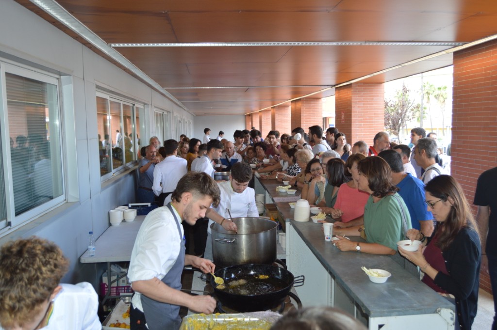 Llegado el mediodía irrumpió en la Plaza de América una charanga muy marchosa disfrazada con los trajes de época, llegando a los soportales del Rectorado donde estaba instalada la zona de almuerzo. Allí, la Escuela Superior de Hostelería de Sevilla cocinaba platos típicos de algunas poblaciones que se repartían gratuitamente, entre ellos, unas riquísimas migas de Fuente Palmera.