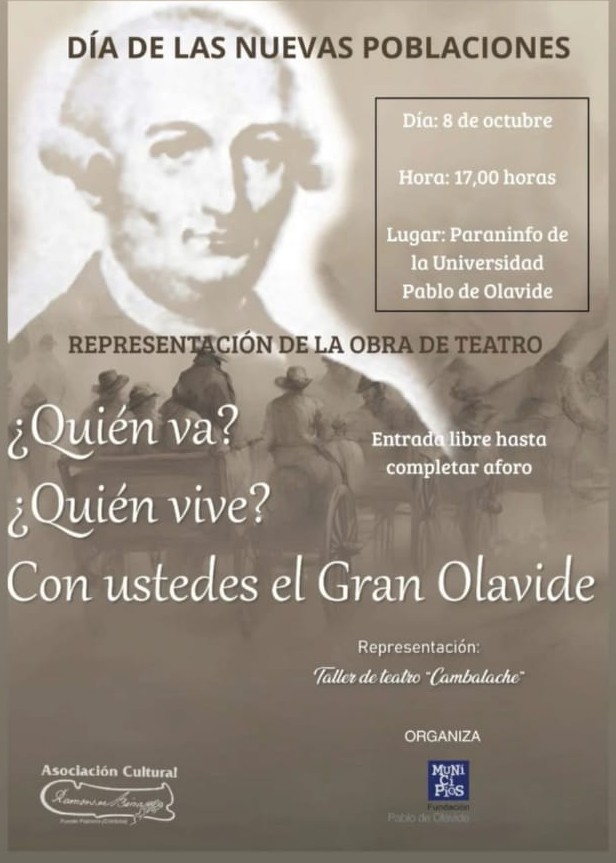 Por la tarde, a las 17:00 horas, el Paraninfo acogerá la representación de la obra de teatro histórica “¿Quién va, ¿quién vive? ¡Con ustedes el gran Olavide!”, a cargo del grupo de teatro Cambalache, de la Asociación Cultural Ramón de Beña, de Fuente Palmera.