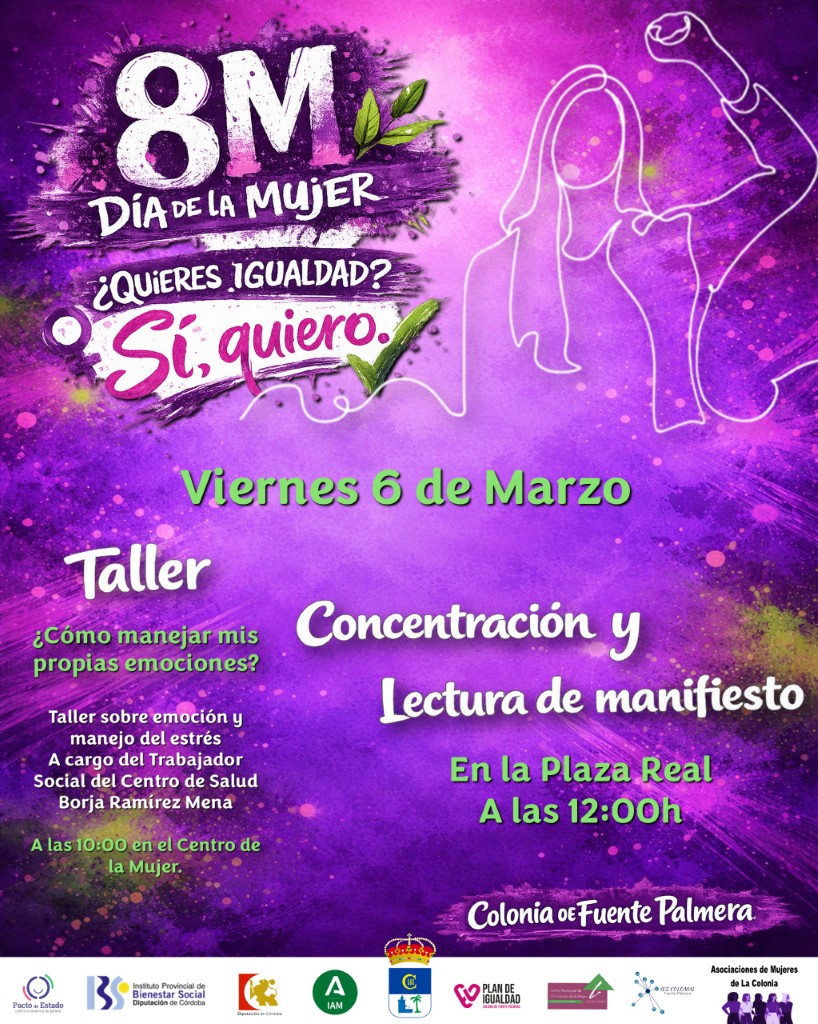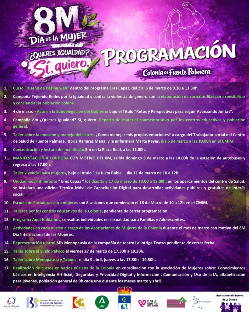 La campaña del 8M, que este año hace un guiño a La Colonia de Fuente Palmera como Pueblo de las Novias bajo el título, «¿Quieres igualdad? Sí, quiero», incluye el tradicional reparto de material divulgativo por los centros educativos y a la población en general. En este sentido, se están elaborando corbatas lilas a modo de detalle para sensibilizar y concienciar a vecinos y vecinas.