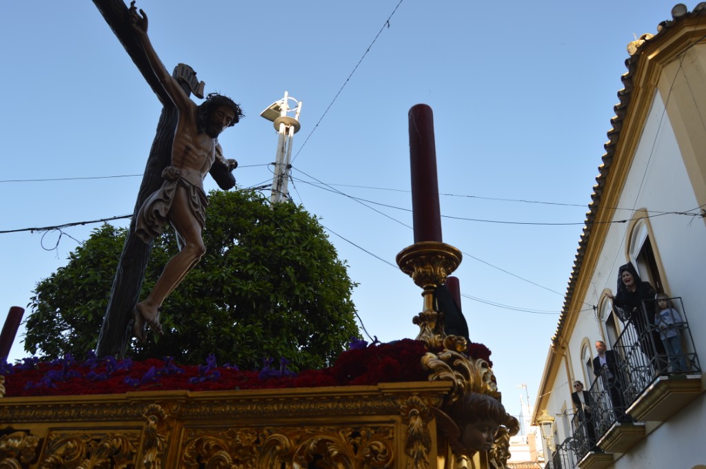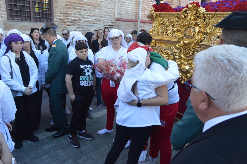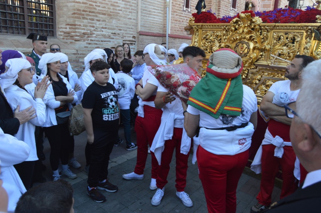 Tras recorrer los primeros metros, al igual que ocurriera en la jornada anterior, las costaleras de Los Dolores le hacían una ofrenda floral al Cristo protagonizando el primer momento emotivo de la tarde. Luego, en el encuentro de ambos pasos en la calle Écija, los costaleros de La Sangre le devolvían el gesto en una ofrenda floral que ya es tradición en este punto.