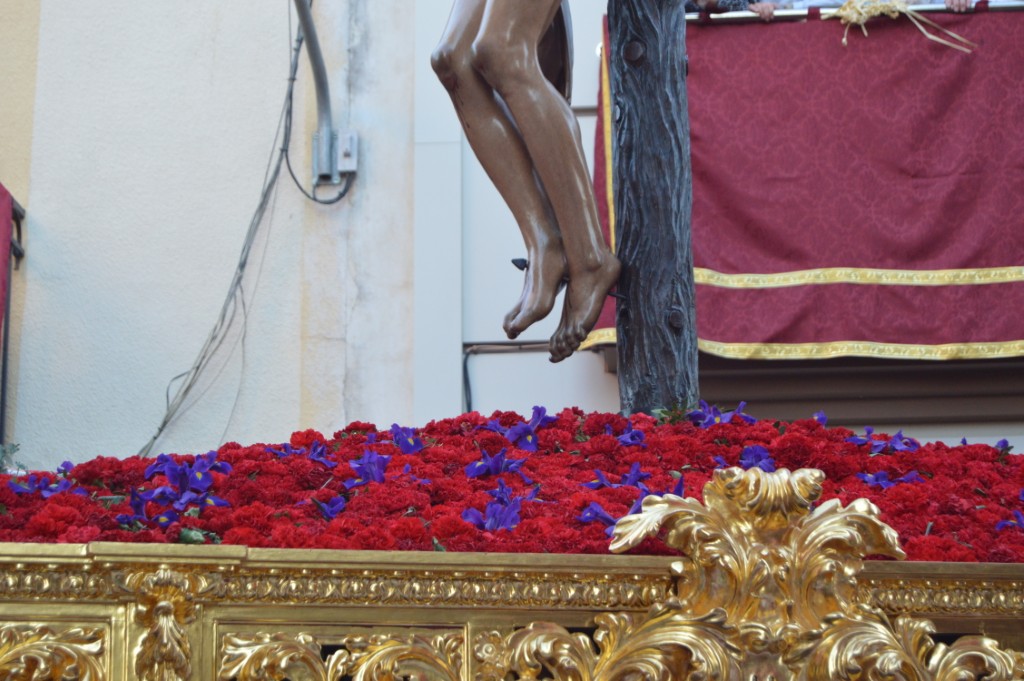El paso ha presentado este año como novedad el dorado del respiradero trasero. Además, en un bonito detalle de la Hermandad de La Sangre, en el monte de claveles rojos del exorno floral resaltaban salpicados cien lirios morados en homenaje al centenario de la Hermandad de Ntro. Padre Jesús Nazareno de Fuente Palmera.